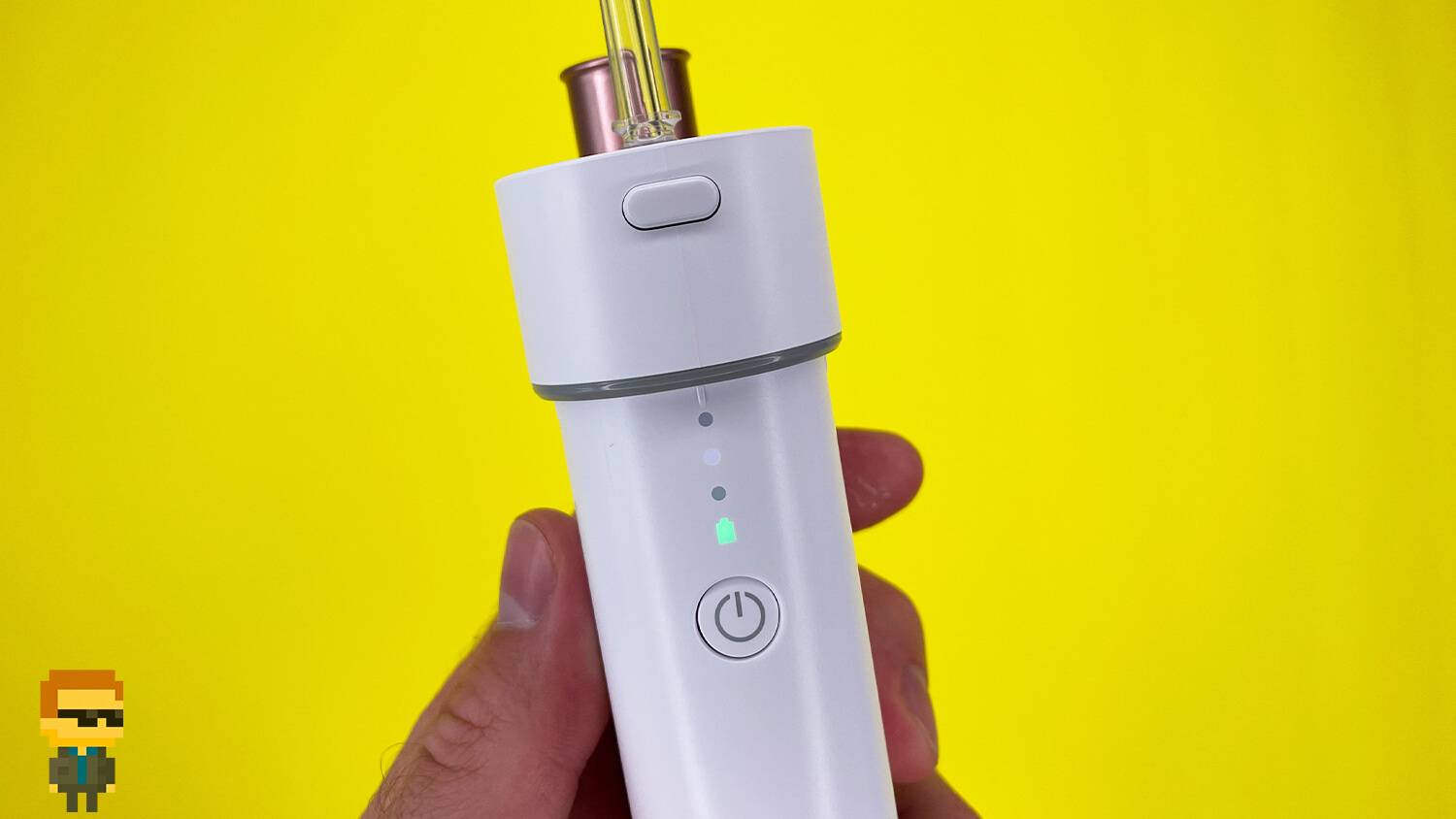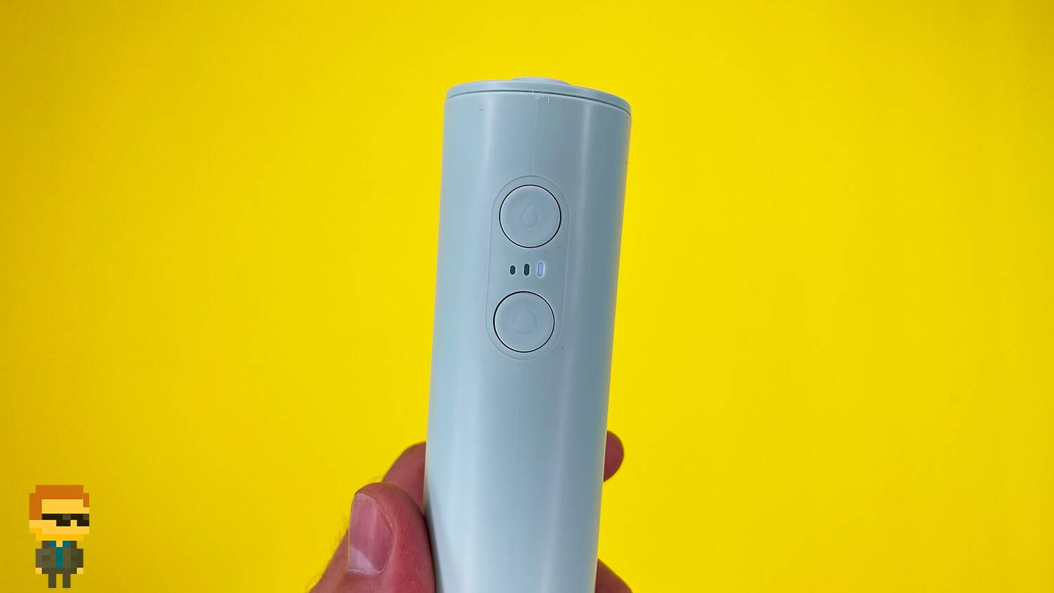 На левой боковой стороне находится кнопка включения/переключения, а также индикаторы заряда батареи и режимов работы. Клавиша управления имеет своего рода защиту от случайного включения, что удобно при транспортировке. Когда ирригатор находится в сложенном виде, кнопка прячется внутри прозрачной колбы, поэтому остаётся недоступной.