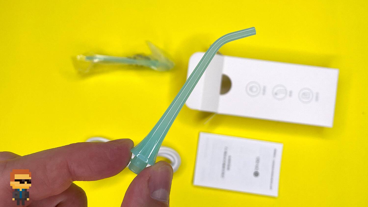 В это же отверстие, при сложенном транспортировочном состоянии прячется рабочая насадка, в виде трубочки, со слегка загнутым концом. В продаже также имеется насадка для чистки поверхности языка от налёта. Все они заменяемые, можно приобрести по отдельности. Здесь же, на верхней части корпуса GF3, расположено отверстие для крепления насадки в рабочем положении.