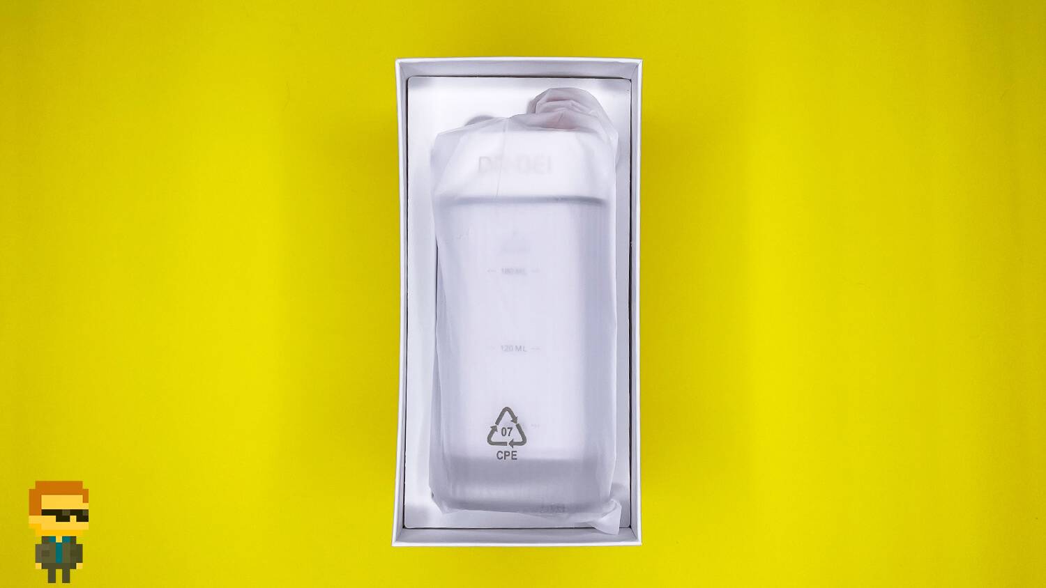 Сам прибор состоит из основного блока и резервуара для воды с мерками на 60, 120 и 180 мл. Общие габариты: 70,5 мм (ширина), 40 мм (глубина) и 161,5 мм (высота). Весит всего 258 г. Держать удобно. Поверхность не гладкая: можно не бояться, что во время процедуры выскользнет из рук. Разъем для подключения кабеля питания находится с одной стороны, кнопки управления – с другой.
