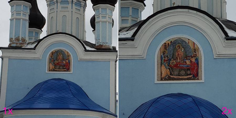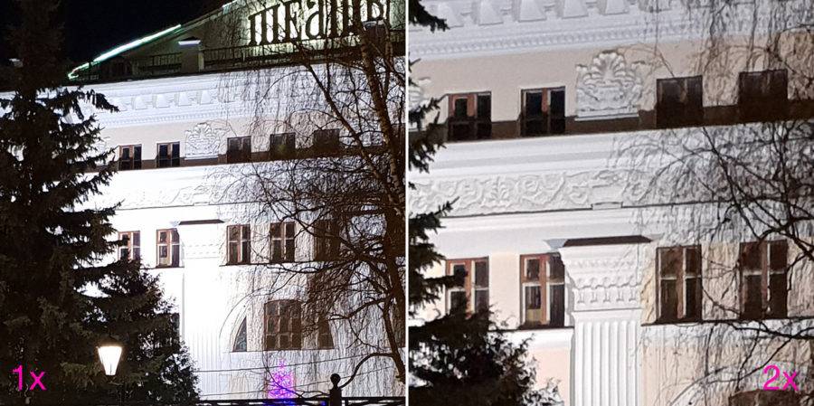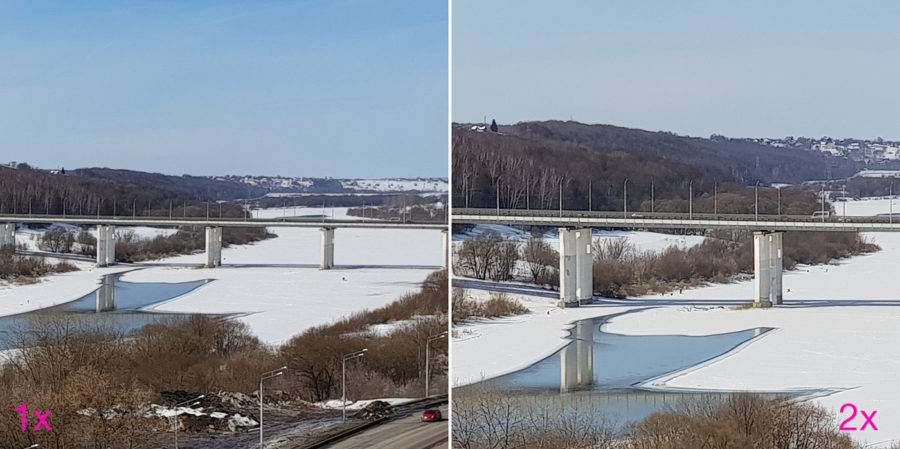 Основная камера получила объектив с фокусным расстоянием 26 мм и светосилой. Второй модуль прикрыт стеклом 52 мм. Соответственно, переключение между сенсорами даёт нам тот самый двукратный зум.