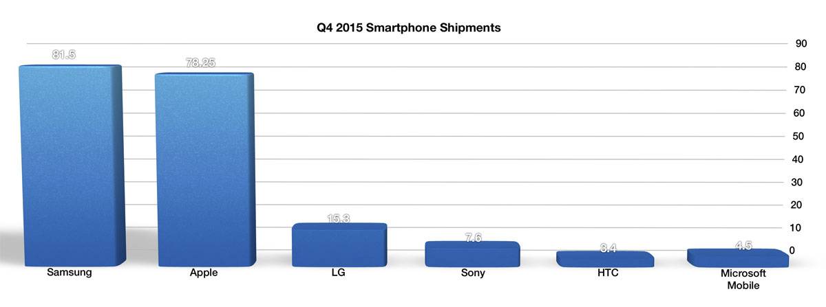 Поставки премиальных смартфонов ($500-600 и выше) сократились с 280 млн ед. в 2012 году до 190 млн. ед. в 2015 году. Это очень серьезно.