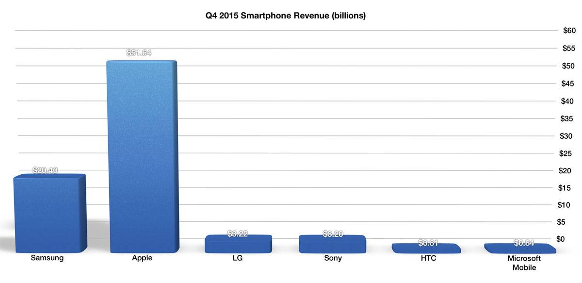 Ниже вы можете увидеть, сколько денег каждый производитель зарабатывает (или теряет) на каждом проданном телефоне.