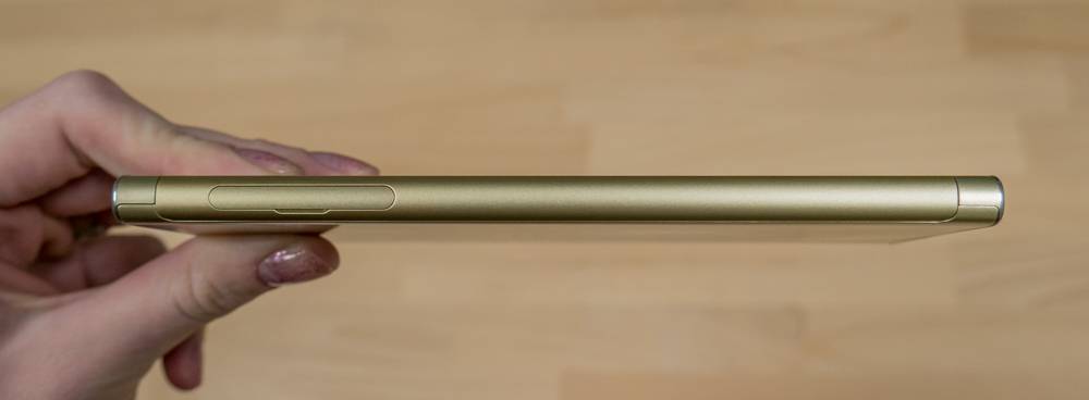 На левой стороне располагается только слот для SIM-карт и карты памяти. Он не гибридный, то есть пользователю не нужно выбирать между установкой карты памяти и второй «симки». Сдвоенный лоток под стандарт nano-SIM выдвигается вместе с крышкой, а карты microSD вставляются непосредственно в корпус. На правой грани находится клавиша регулировки громкости, кнопки питания и запуска камеры. Несмотря на безрамочный дизайн, инженерам Sony все-таки удалось встроить сканер отпечатков в клавишу включения. Отчасти этому помогла переменная толщина чуть закругленной металлической рамки. Изгиб металла также положительно влияет на эргономику устройства. Если вы берете смартфон одной рукой и подставляете к нижней части мизинец для лучшего хвата, грани корпуса не впиваются в кожу и позволяют комфортно держать устройство даже в течение длительного времени.