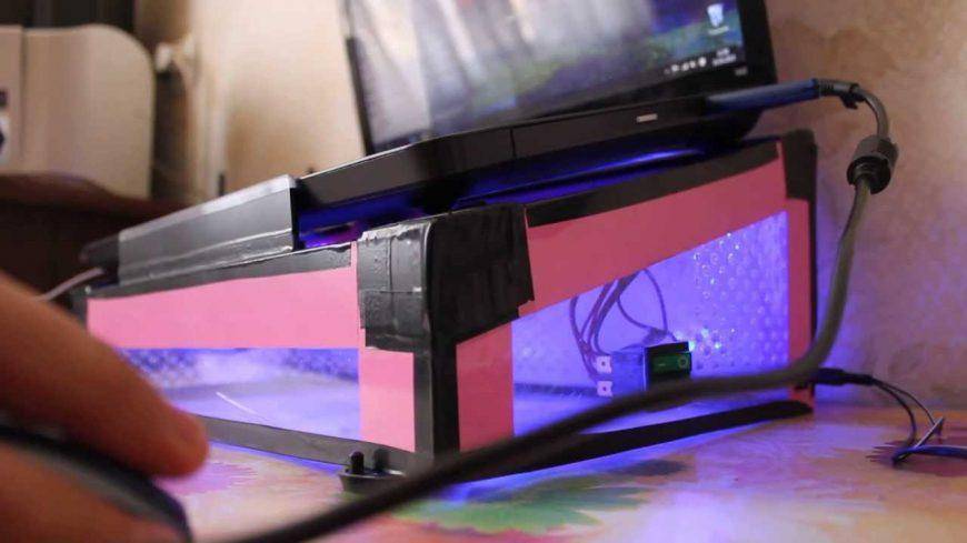 Как сделать подставку для ноутбука. В первую очередь надо определиться с месторасположением вентилятора. Лучше всего подходит торец. Обязательно надо учесть места, где есть отверстия для вентиляции в ноутбуке. Самые нагревающиеся части – видеокарта и процессор – требуют прохлады в первую очередь. Под ними вентилятор будет находиться на своем месте.