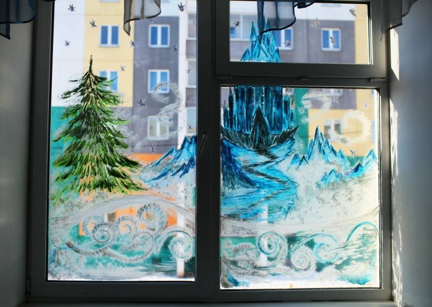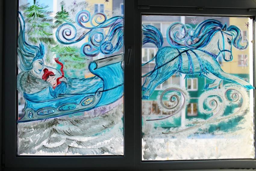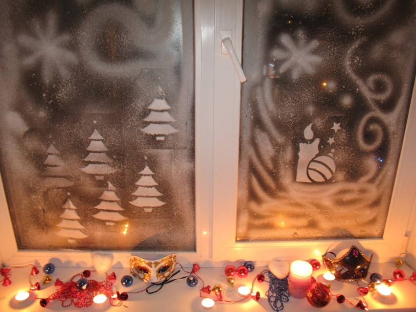 Еще в советские годы окна разрисовывали с помощью банальной зубной пасты. Это был вполне доступный по тем временам материал. Новогодними картинами с его применением украшали не только окна квартир, но и витрины магазинов, детских учреждений, клубов. Использование зубной пасты и сегодня не потеряло актуальности. Ею можно нанести оригинальный узор на стекло, а можно сделать фон, из которого проступают различные прозрачные силуэты на новогоднюю тематику — часы, снежинки, елочные игрушки, Дед Мороз и Снегурочка.