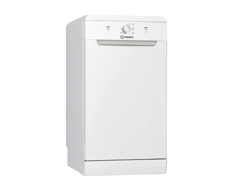Электричества на один рабочий цикл тратится не больше 0,83 кВт-ч, воды – до 11,5 литров. Ширина корпуса – всего 45 см, что позволяет устанавливать Indesit DSCFE 1B10 в малогабаритной кухне. Верхняя