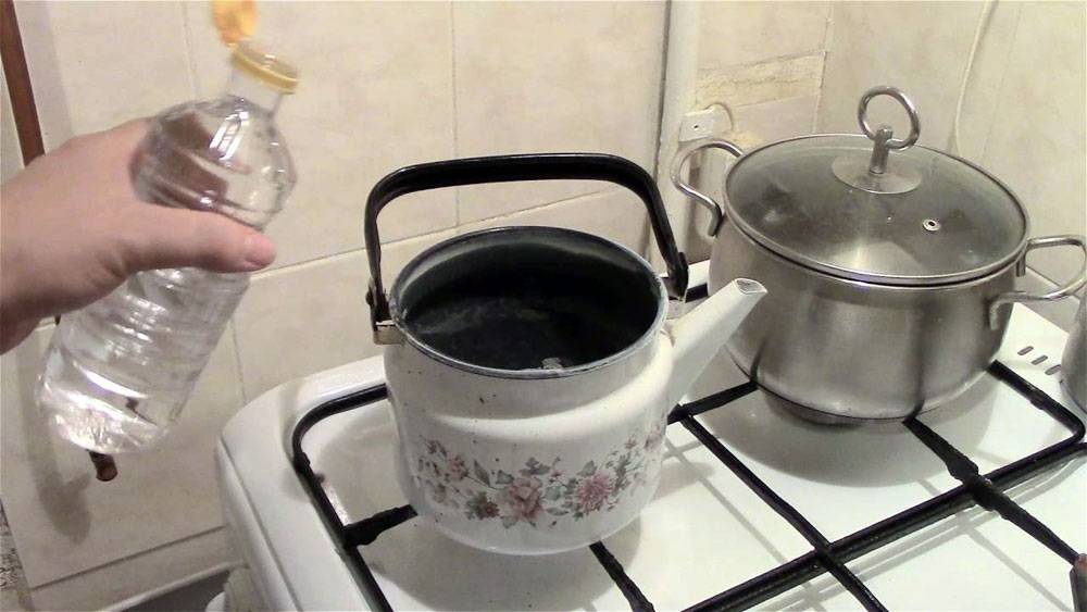 - Для очищения налета потребуется налить воду, чтобы она покрыла загрязненную таким образом поверхность.