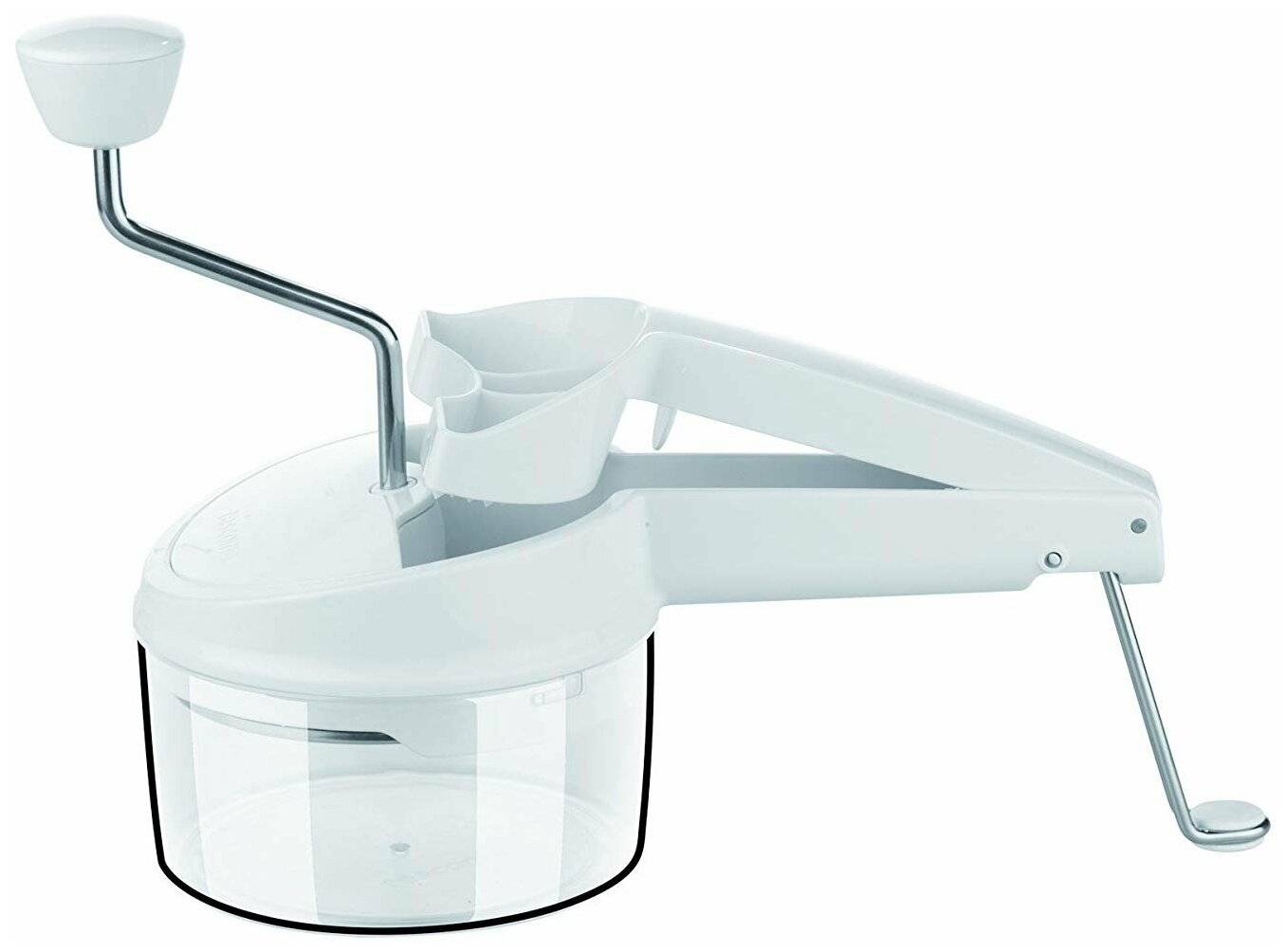 Используется для измельчения овощей и фруктов. В комплект входит основа и 3 насадки, которые измельчают в пюре, шинкуют и нарезают крупной и мелкой соломкой. Сделана из пластика и нержавейки. Легко можно очистить в посудомойке. Вес — 110 гр.
