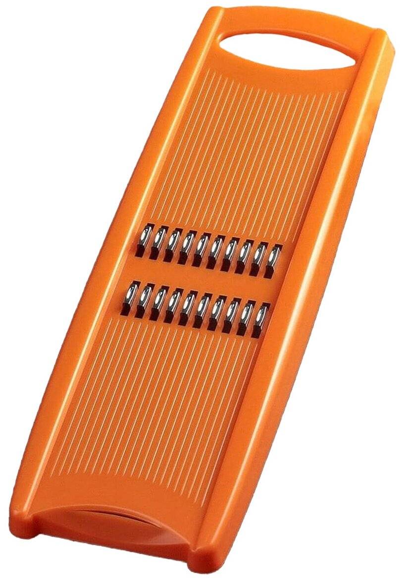 По конструкции устройство похоже на овощечистку и представляет собой металлическую терку с диагональным отверстием посередине. Подходит для нарезания овощей соломкой или тонкими плоскими ломтиками.
