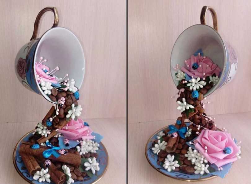 Кофейные зерна нужно приклеивать плотно, создавая эффект водопада (или «кофепада»), полностью закрывая гипсовую основу. На блюдце некоторые зернышки можно наклеить в два яруса, имитируя брызги. А еще такой топиарий рекомендуется украсить парой палочек корицы, звездочками бадьяна или искусственными цветами.