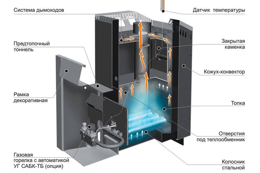 В продаже имеется большое количество банных печей на газовом топливе. Большинство из них отечественного производства, и это не случайно — импортные конструкции плохо работают в наших условиях. Они нуждаются в стабильной подаче электроэнергии, поскольку практически все конструкции наддувные.