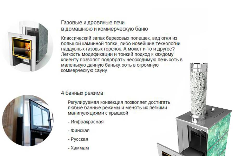 Модель может прогреваться до 750 градусов, а температура в дымоходе доходит до 300 градусов, что сокращает расход топлива. Благодаря расположенным по бокам конвекционным пластинам идет быстрая передача тепла и высокая температура в парной.