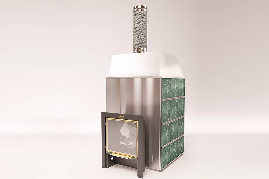 Специальная конструкция с каменкой закрытого типа. Это позволяет обеспечить максимальный нагрев без потери тепловой энергии. Мощность печи — 80 кВт, рассчитана на использование в помещении объемом 40-70 м3.
