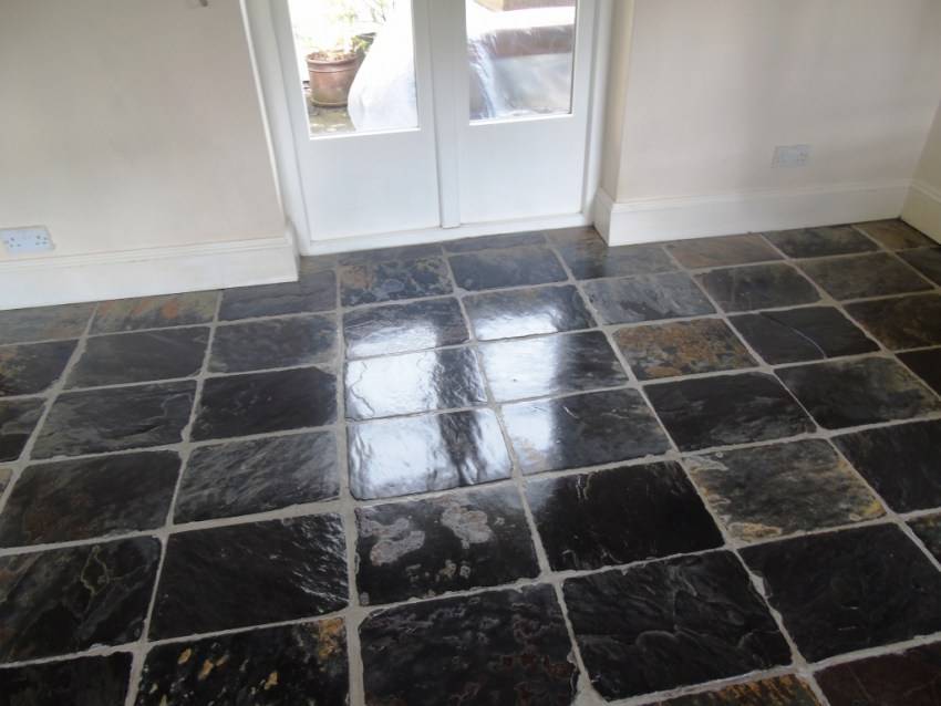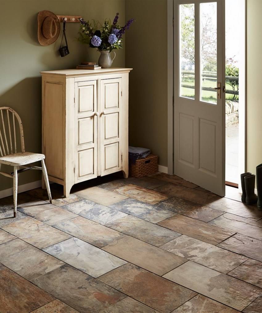 Плитка и ламинат на основе полихлорвинила используются давно, они отлично подходят в качестве напольных покрытий в кухне, ванной комнате и даже гостиной. Плиты оказываются слишком мягкими для отделки входа в коридор, поверхность быстро покрывается царапинами и темнеет.