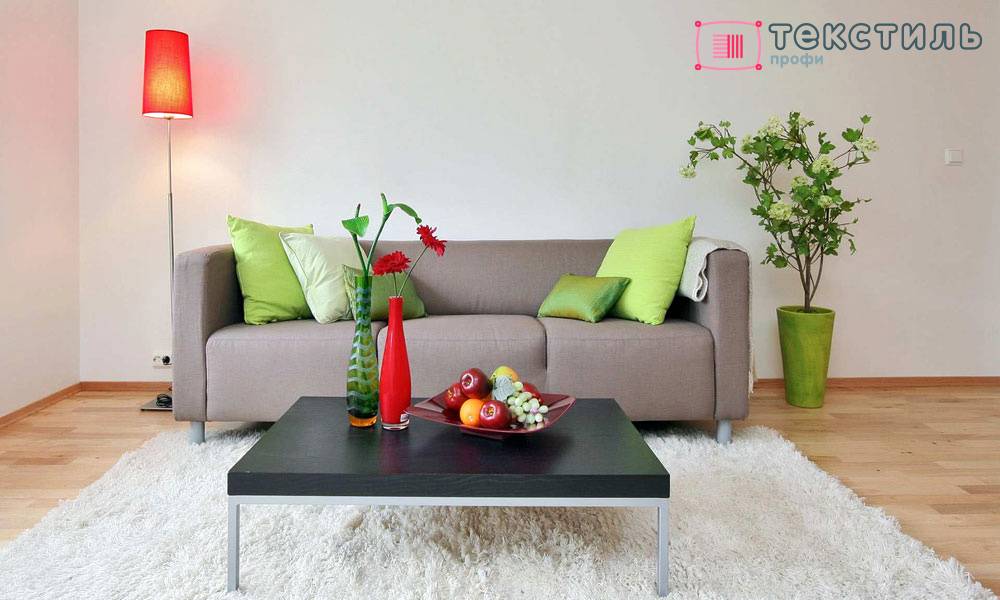 Если интерьер получился слишком спокойным и монотонным, разбавить его можно постелив яркий ковер. В таком случае потребуется еще несколько мелких элементов декора — подушка, ваза, картина и т.д.