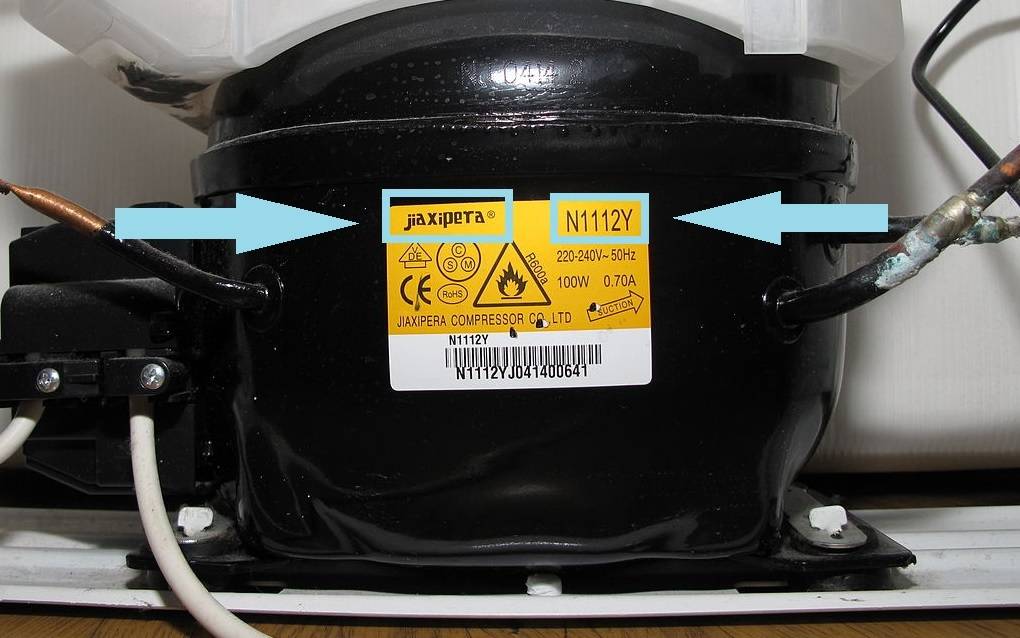 Узнать модель и производителя компрессора холодильника несложно. Загляните в нижнюю часть задней стенки. На корпусе компрессора долен быть шильдик с его данными (см. фото). Если наклейка отсутствует – ищите информацию в документации.