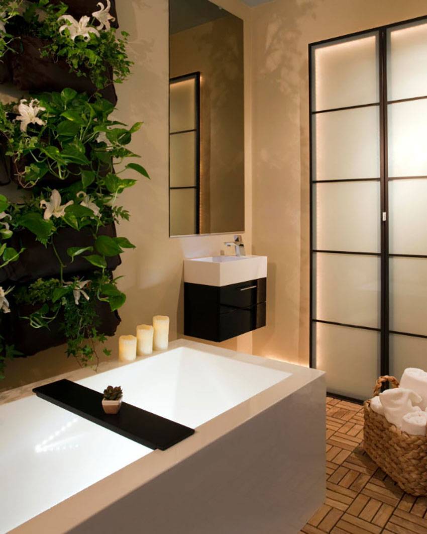 Учитывая нашу реальность, намного проще стилизовать ванную в японском стиле, чем оформить по всем правилам. Например, деревянную купель можно заменить обыкновенной ванной в деревянном обрамлении (это может быть кедр, дуб, лиственница). При чём желательно, чтобы она была тёплого карамельного цвета.