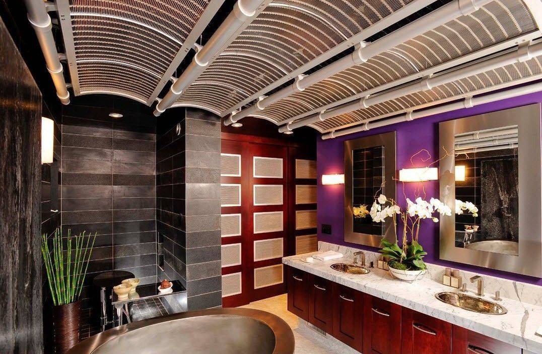 Потолки для таких ванн не рекомендуется делать вычурными, с применением каких-то архитектурных деталей. Натяжные потолки без всяких излишеств или обычная побелка будет идеальным вариантом для этой ванной.