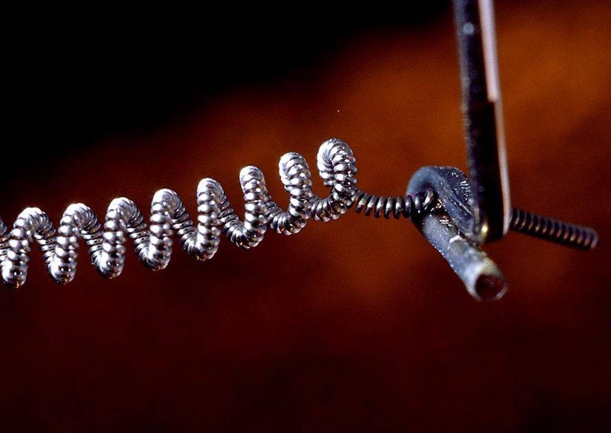 - Основная рабочая деталь – вольфрамовая спираль. Обладает сопротивлением в три раза больше, чем медный материал. Из него достигается выплавка максимально тонких элементов. Электроды поддерживают данную спираль и переводят ток.