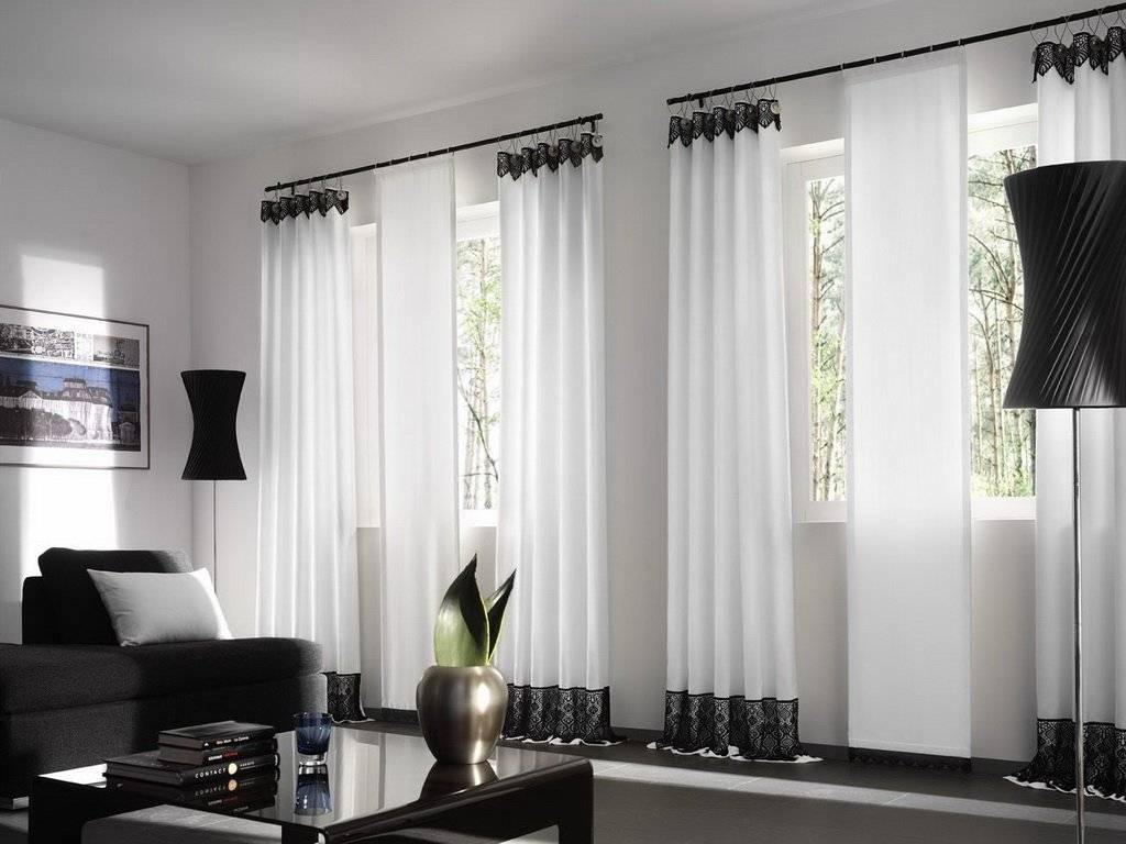 Гостиные, спальни в японском стиле, хай-тек можно украсить изделиями разного оттенка и дизайна. В современном стиле используют рулонные шторы, пластиковые панели, жалюзи из бумаги, металла, бамбука.
