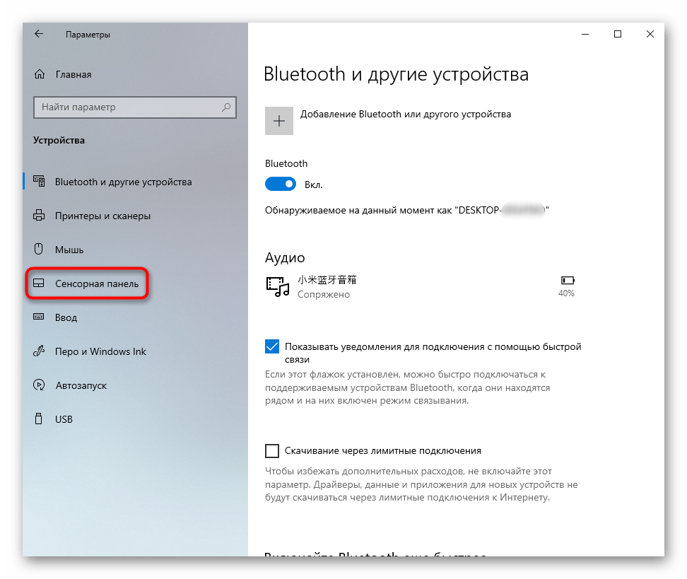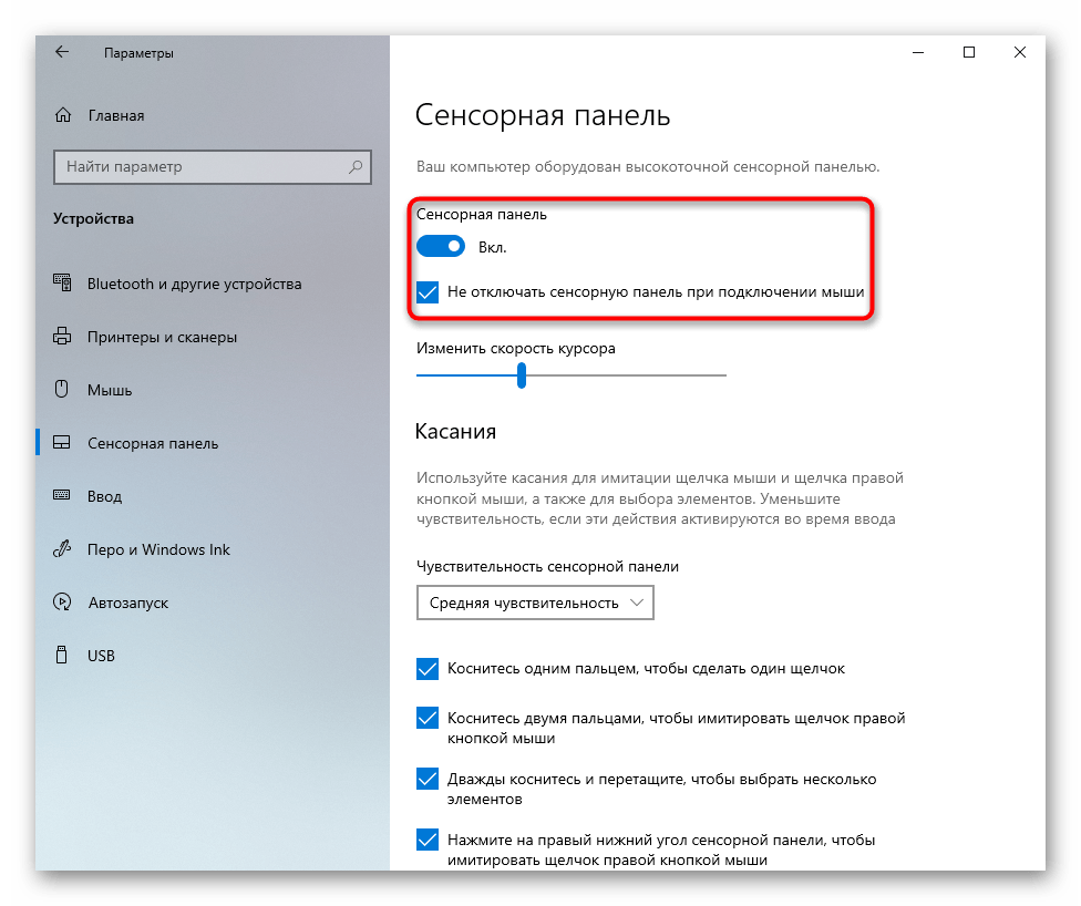 Через панель слева переключитесь в раздел «Сенсорная панель».