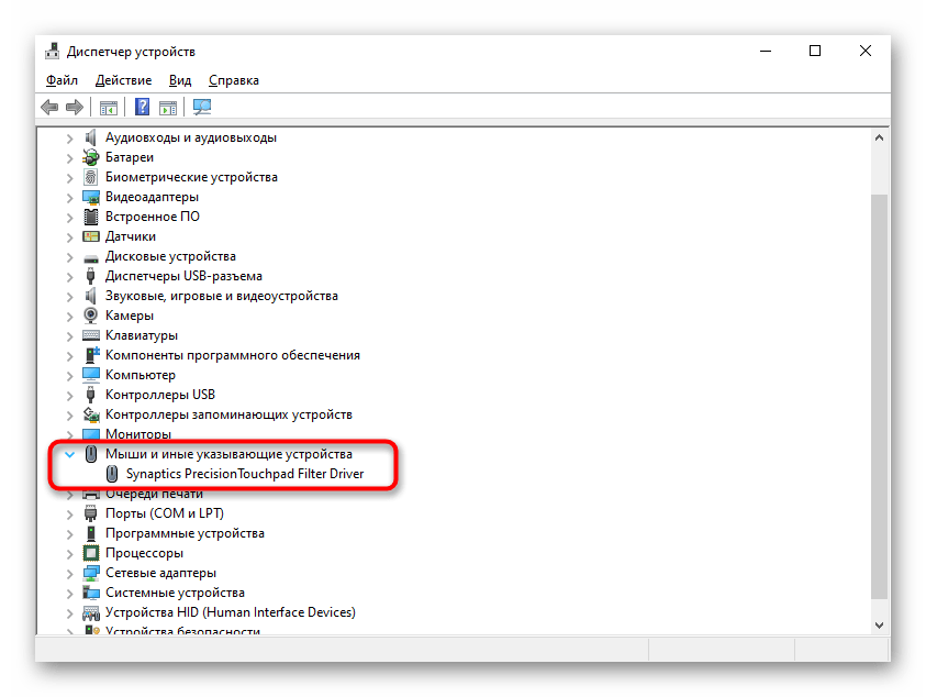 Отыщите раздел «Мыши и иные указывающие устройства», разверните его — там должно быть название сенсорной панели, содержащее в себе слово «driver» и/или «touchpad».