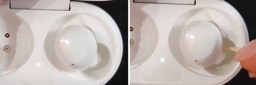 Плохой контакт в кейсе – самый простой случай, извлеките наушник из кейса и внимательно посмотрите нет ли в углублении посторонних предметов, пыли или грязи. Если есть, аккуратно извлеките их и вновь попробуйте установить наушник для зарядки, при этом слегка надавив на него с той целью, чтобы он надёжно подключился к контактам;
