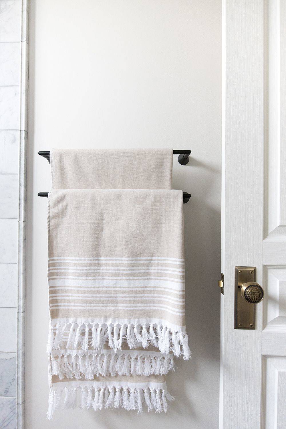 Еще один способ развесить банные простыни, не прибегая к сверлению стен, — надверная вешалка.