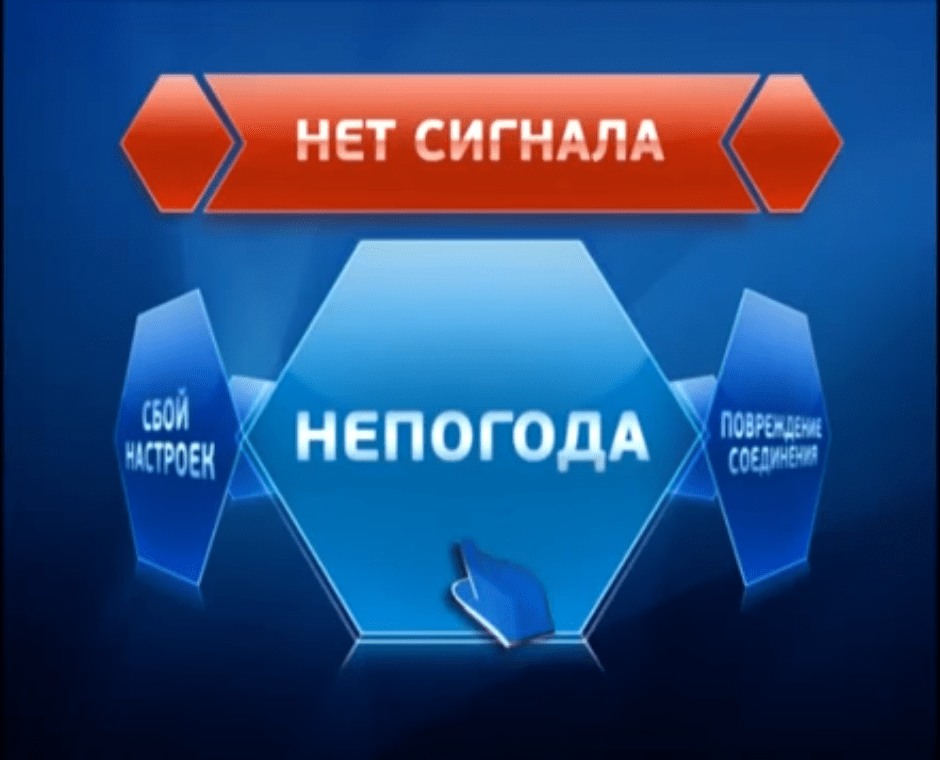 В дождливую, снежную погоду или при возникновении ударов грома, молнии ухудшается качество приема сигнала. Поэтому появление сообщения «Нет сигнала» возможно. Можно попробовать отключить оборудование и включить через несколько минут. Если проблема не ушла, то стоит дождаться хороших погодных условий.