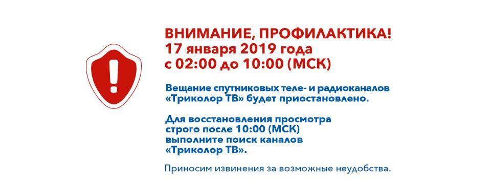 - Профилактические работы у представителя услуг. Наберите колл-центр компании, чтобы получить информацию относительно времени начала и продолжительности работ. «Инфоканал» Tricolor бегущей строкой оповещает время начала профилактики.