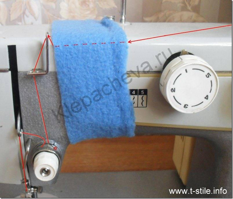 Я поступаю следующим образом — полоску ткани оборачиваю вокруг рукава швейной машинки, нитку пропускаю под этой полоской ткани. Полоска ткани не дает нитке скручиваться в петли.
