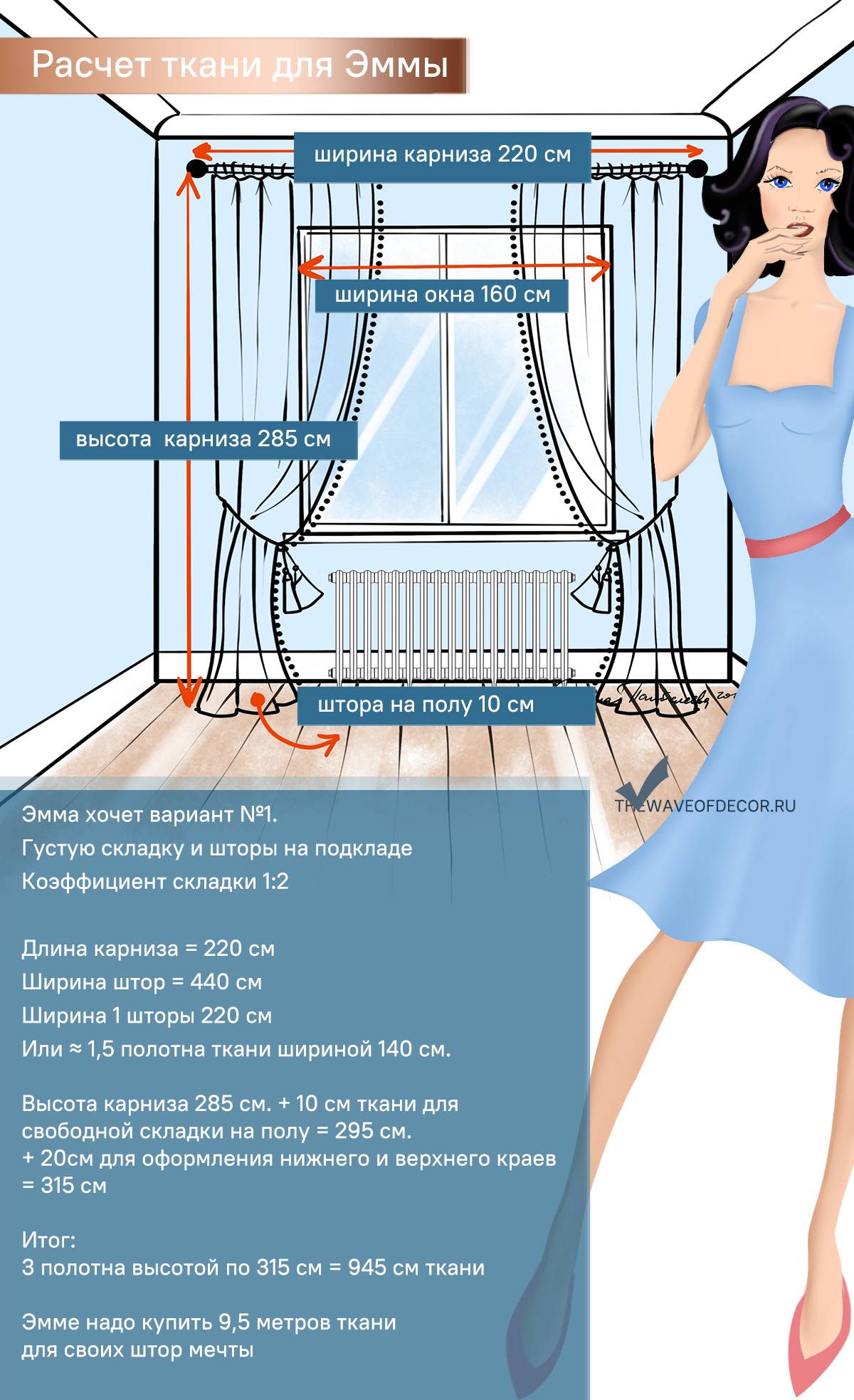 Формула расчета ткани без рисунка для штор на примере окна Эммы: