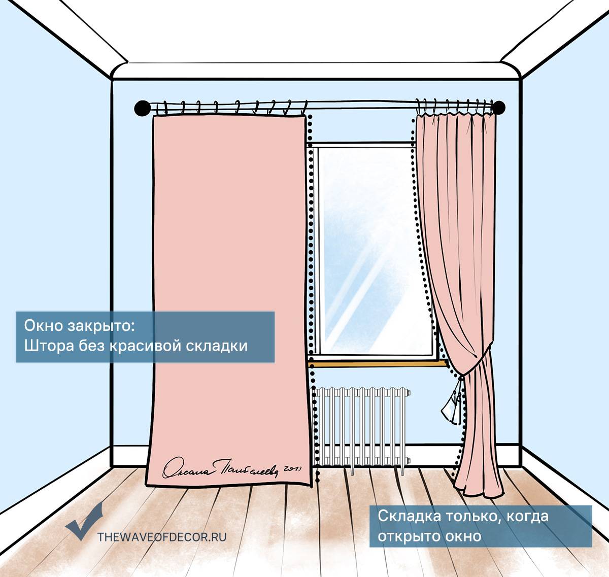 Берем на вооружение вариант, когда нужна красивая складка у зашторенного окна и у открытого окна!