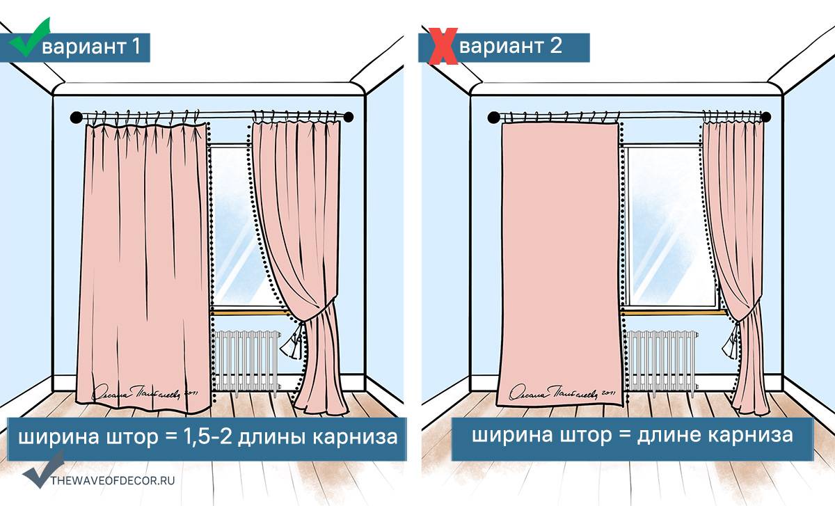 Ширина шторы зависит от выбранной ткани и от желаемых складок.
