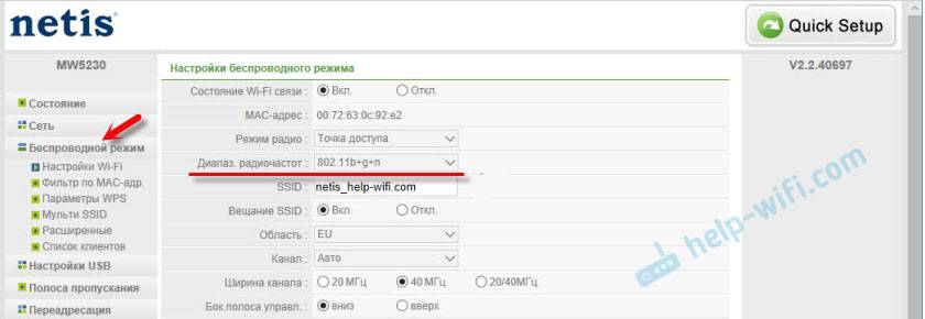 Там будет меню “Диапаз. радиочастот”. В нем можно сменить стандарт Wi-Fi сети. По умолчанию установлено “802.11 b+g+n”.