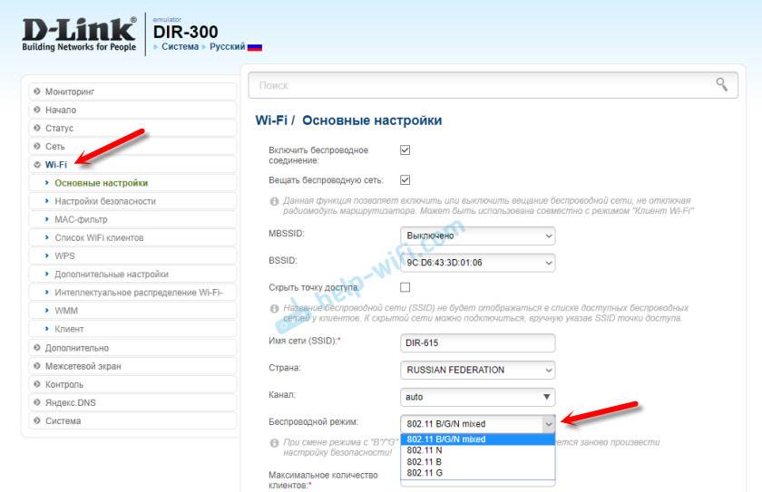 Так как у них есть много версий веб-интерфейса, то рассмотрим несколько из них. Если в вашем случае светлый веб-интерфейс как на скриншоте ниже, то откройте раздел “Wi-Fi”. Там будет пункт “Беспроводной режим” с четырьмя вариантами: 802.11 B/G/N mixed, и отдельно N/B/G.