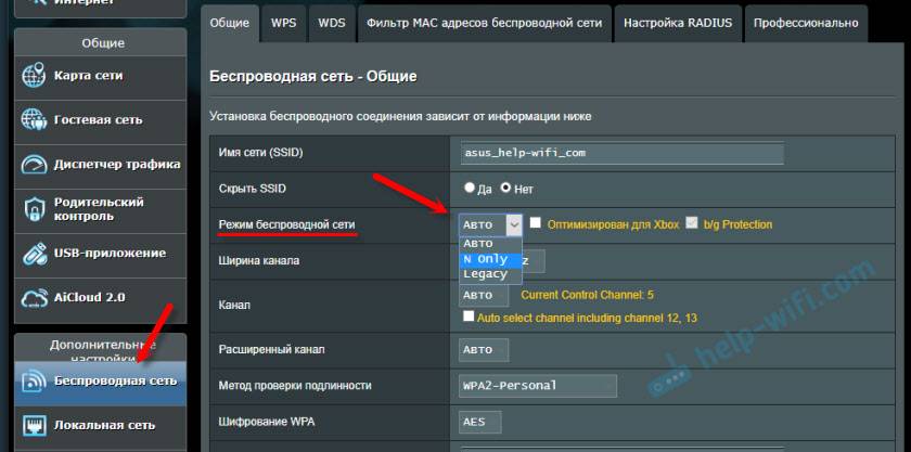 Дать конкретные инструкции для всех устройств и версий программного обеспечения просто невозможно. Поэтому, если вам нужно сменить стандарт беспроводной сети, и вы не нашли своего устройства выше в статье, то смотрите настройки в разделе с названием “Беспроводная сеть”, “WiFi”, “Wireless”.