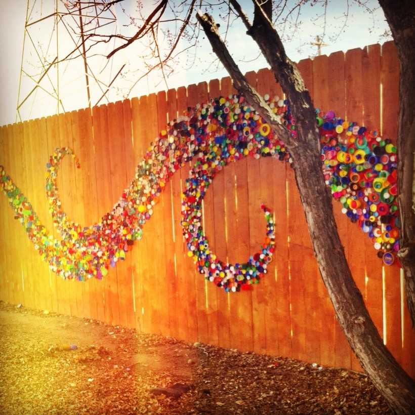Также, если в дне просверлить небольшую дырочку, стеклотару можно собрать вертикально на толстую проволоку. Конструкцию можно подвесить вверху на перекладину, закрепить внизу – получится оригинальный забор. Установленные вертикально, горлышком вниз, стеклянные изделия в форме прямоугольника – отличное ограждение для грядки.