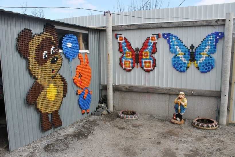 Для добавления изюминки на территории загородного дома или дачи, можно так же сделать своеобразные поделки из пустой стеклянной тары. Из бутылок выполняются: