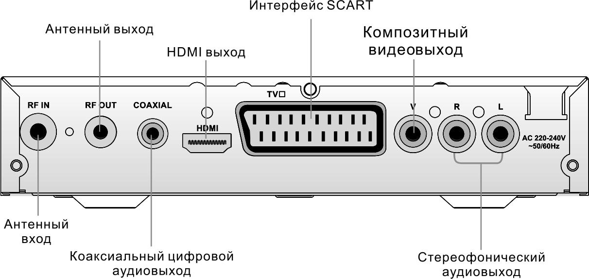 - кабелем Scart соединить тюнер и ТВ между собой;