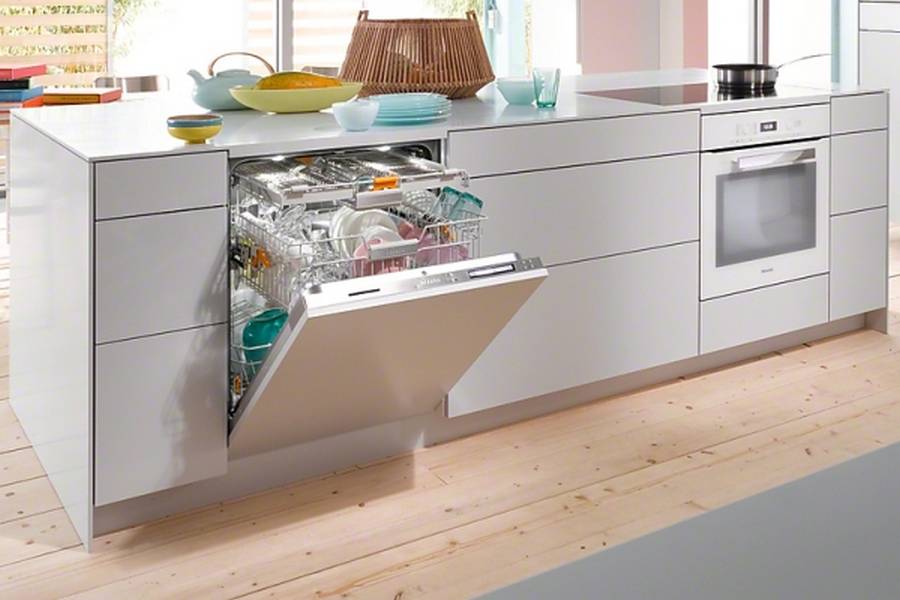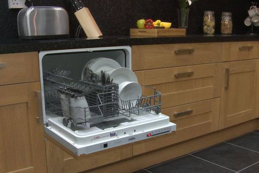 Среди небольших по размеру моделей есть и встраиваемые посудомойки, которые можно разместить как под столешницей, так и выше, в «пенале» или тумбе на высоте 90-120 см
