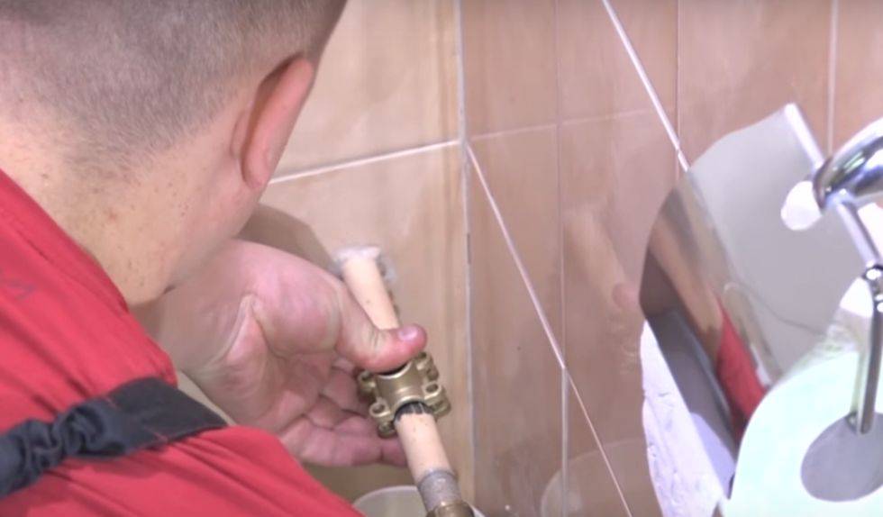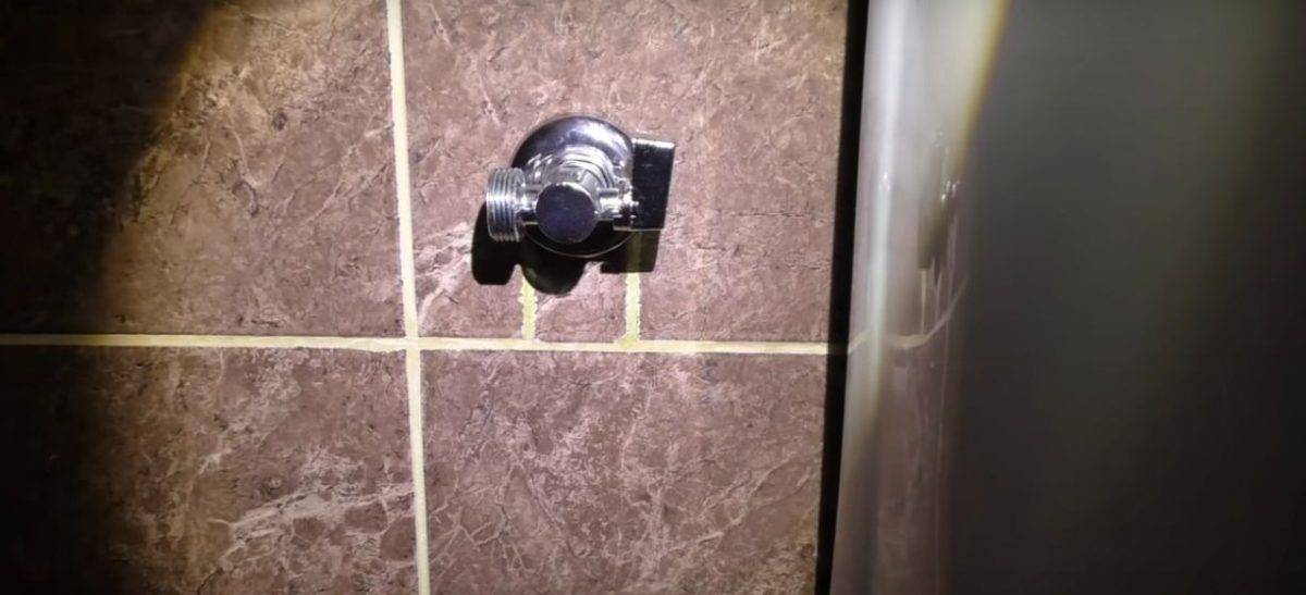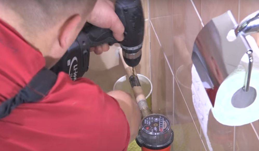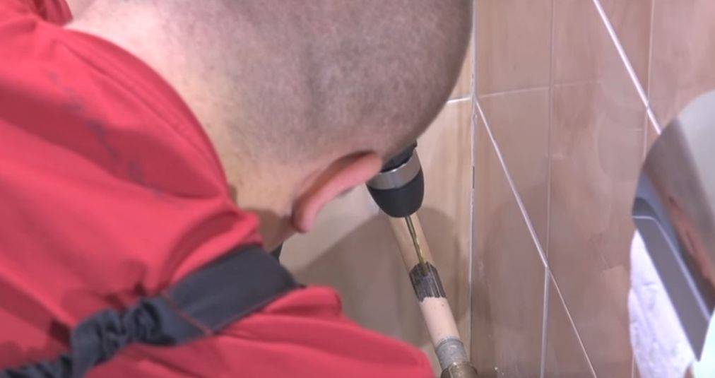 1. Вырезаем сквозное отверстие в стене для вставки крана. Для этого лучше всего использовать электродрель. После закрываем неровности плиткой. С другой стороны вырезаем отверстие в трубе (как в случае с установкой муфты) и прикручиваем переходник.