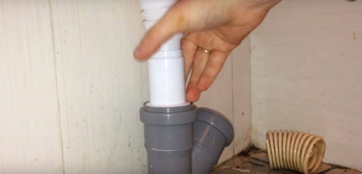 1. Покупаем в магазине специальный патрубок для подключения труб с умывальника и стиральной машины. После этого монтируем его в то же отверстие, где ранее была труба от умывальника.