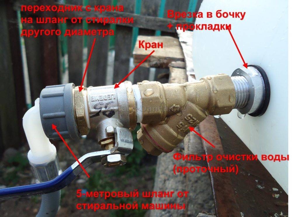 - Наливом в бочку воды проверяется герметичность соединения. Если обнаружится течь, которую не удается устранить подтягиванием гаек, придется слить воду и заново установить штуцер с добавлением под контргайку силикона. В этом случае надо до следующего заполнения дать ему высохнуть.