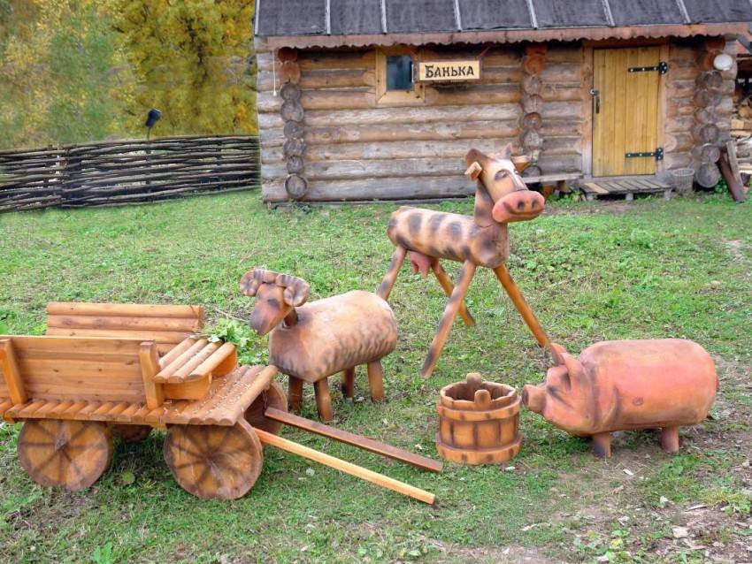 Обязательный атрибут дачи – качели – также можно выпилить из дерева. Делают из него и декоративные мельницы, колодцы, мостики. Украшением сада считаются деревянные резные беседки и лавки.