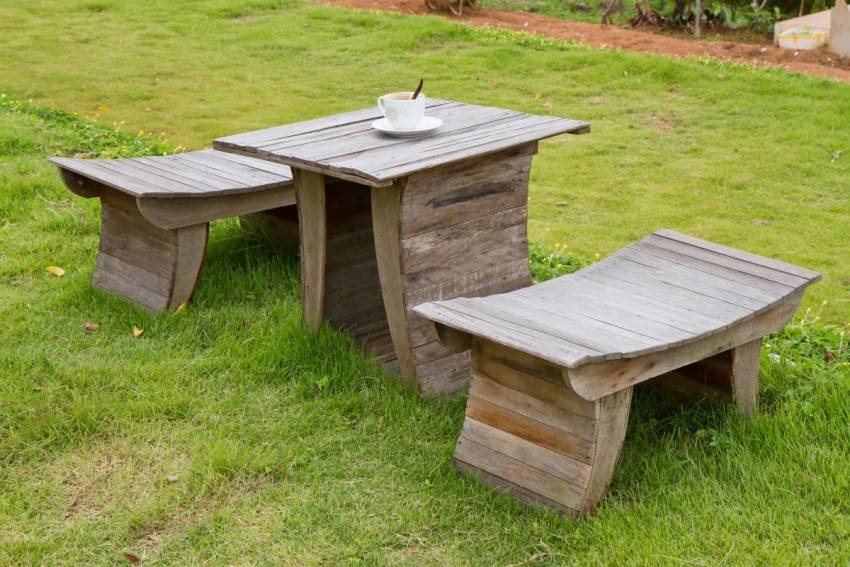 Для обустройства заднего двора подойдёт садовая мебель, например, кресла из массива дуба или скамьи из липы. Можно сделать несколько лавочек для цветочных горшков.