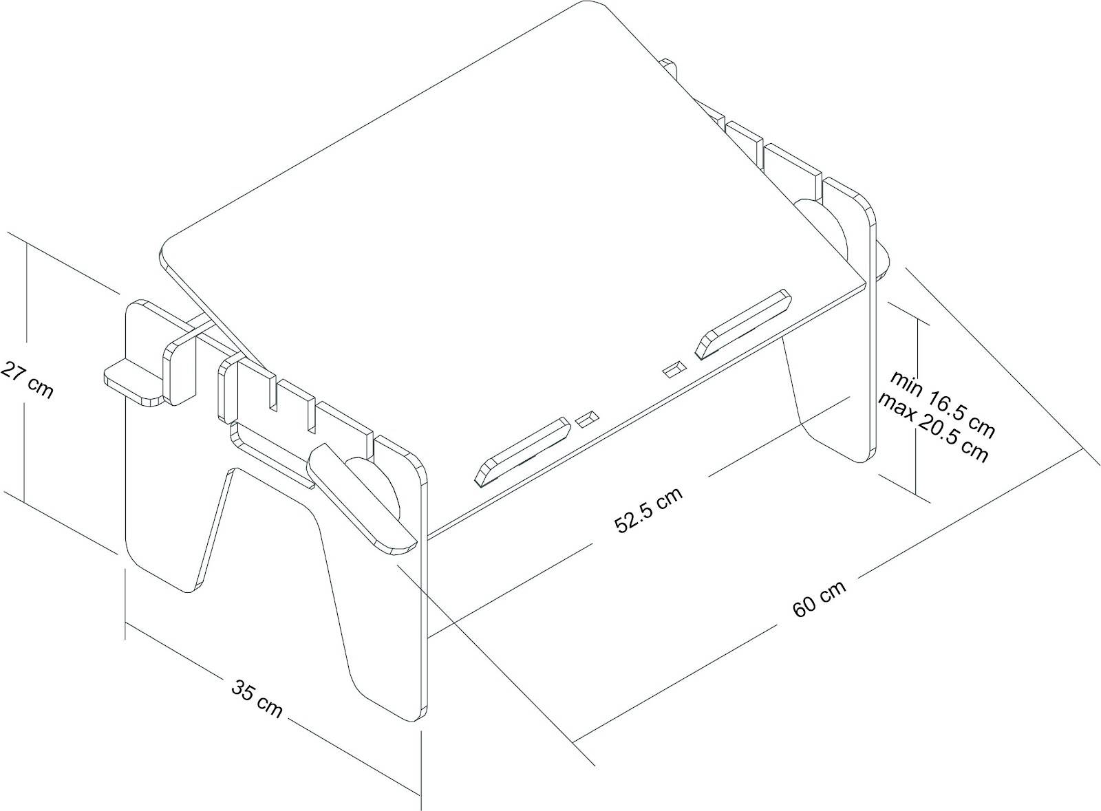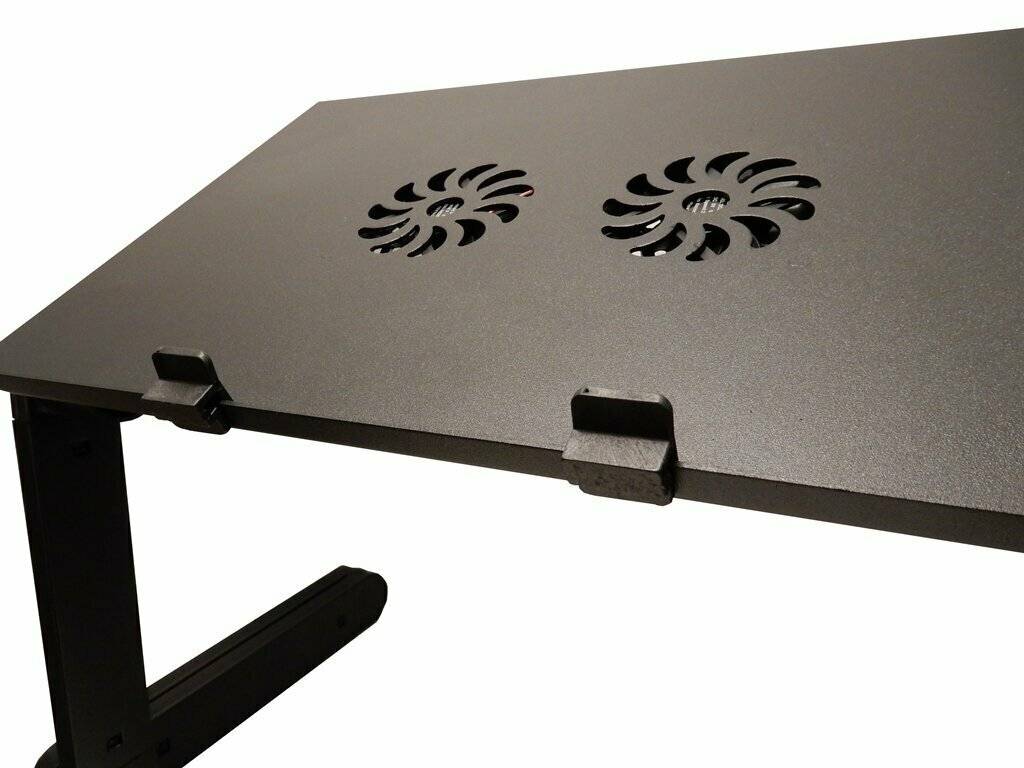 В качестве подставки для ноутбука в столешницу вкручены два подпятника, которые при необходимости свободно выкручиваются. Для фиксации подвижной части столешницы в поднятом положении используется стальной пруток, который вставляется в углубление на оборотной стороне столешницы. В данном варианте угол наклона столешницы не регулируется.