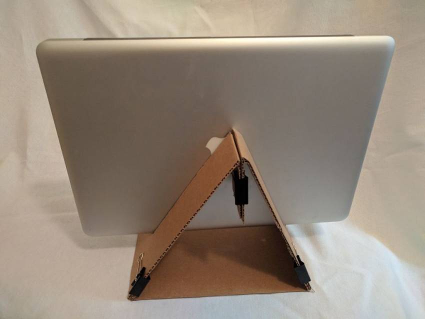 Следующую подставку можно использовать для книги или планшета. Сущность изготовления аналогичная, остается лишь отметить по величине свой гаджет. При работе нужно применять картон, который хорошо гнется. Картонная подставка очень удобна в использовании, ее легко взять с собой.