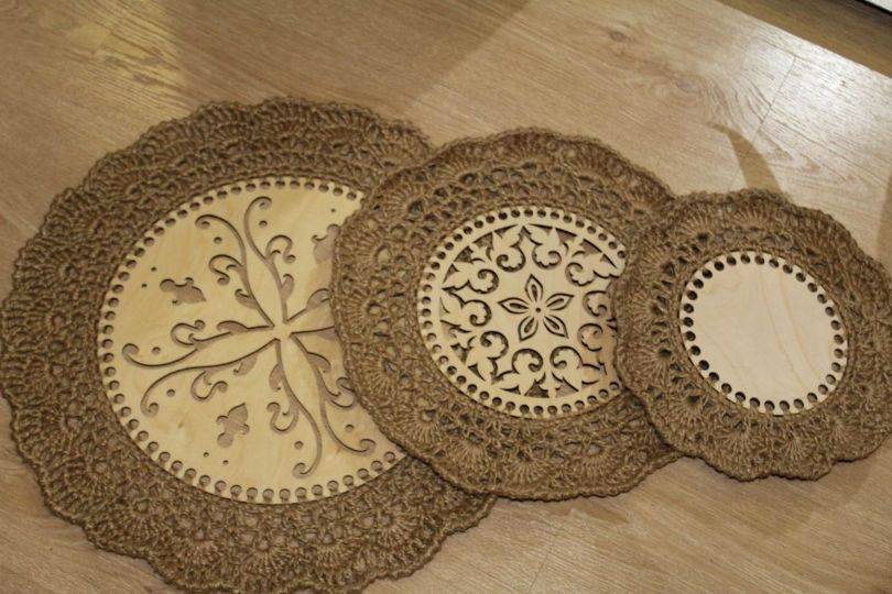 Комбинируя применение разных материалов, можно добиться еще большей выразительности дизайна и форм подложек. В данном случае ажурная фанера в центре круга дополнена вязанием по периферии.