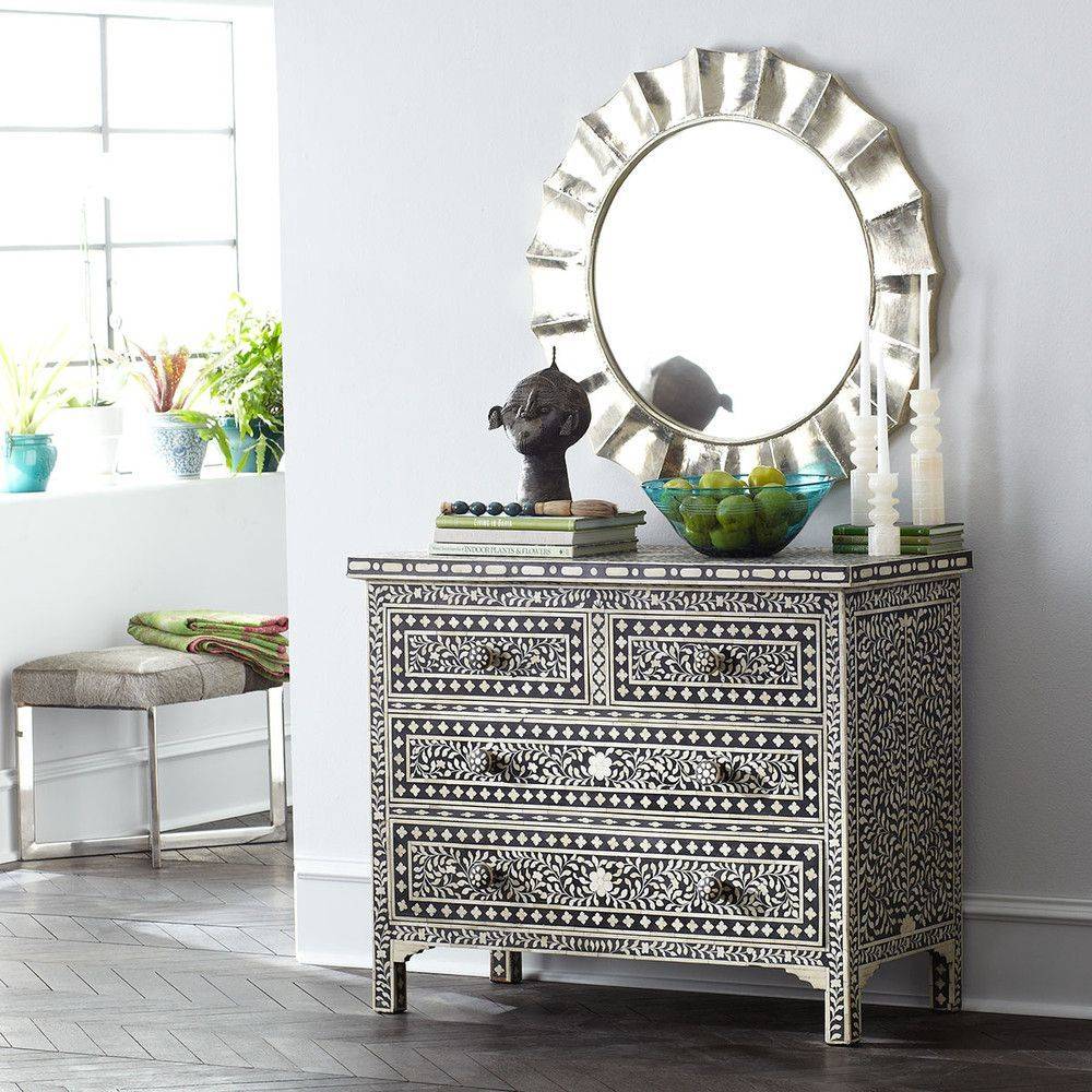 Отличительная особенность интерьер дома в восточном стиле — невысокая мебель: диваны без спинки, оттоманки, пуфы и резные журнальные столики. Платяной шкаф? Исключено. Вещи хранят в специальных нишах, дверцы которых украшают резьбой и витражным стеклом. Но если для комнаты выбран арабский стиль, то часто функцию ниши выполняет деревянный сундук (в современной интерпретации — комод). Его тоже богато украшают, декорируют металлическими резными элементами. Образец такого сундука вы видите на фото выше. Для сравнения — комод в мавританском стиле на фото ниже.